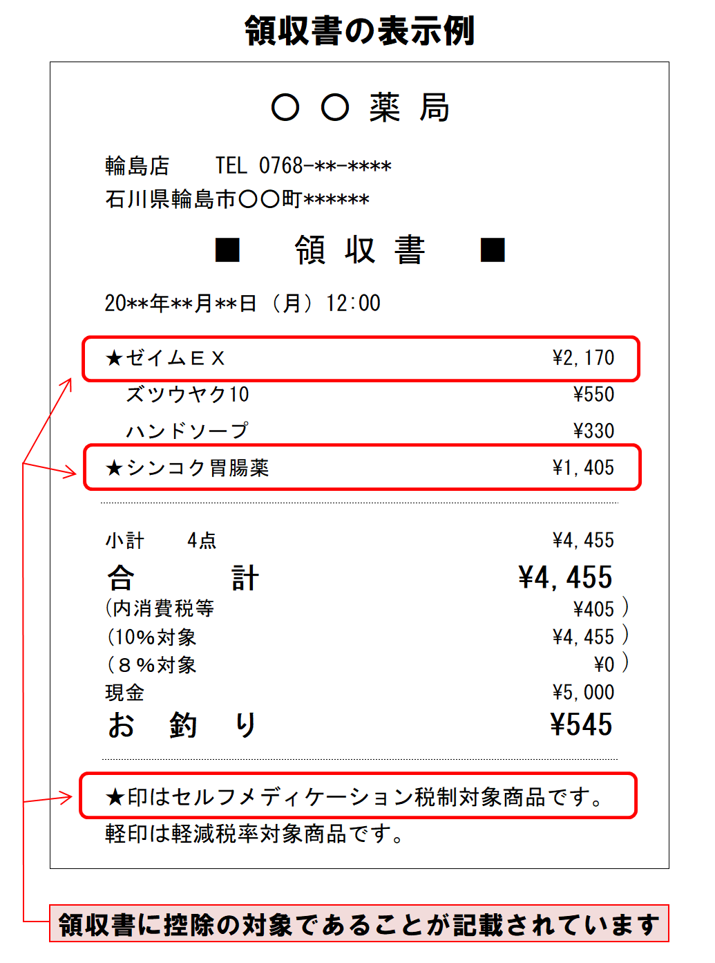 また、薬局の領収書は、下記のように対象商品か分かるようになっています。