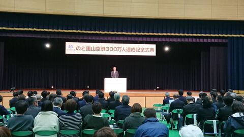 10月27日にのと里山空港の利用者が300万人を達成したとして、日本航空学園の体育館にて記念式典が開催されました。市長ものと里山空港利用促進同盟会会長として出席し、閉会の挨拶を述べました。