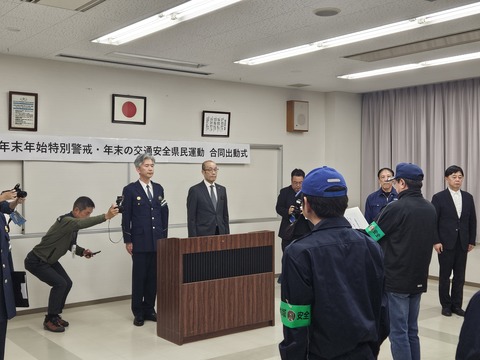 輪島警察署にて、年末年始特別警戒・年末の交通安全県民運動出動式が行われました。これは、年末年始に向けた防犯と交通安全の啓発・取り締まり強化を目的に開催され、市長も出席し挨拶およびパトロールベストの贈呈を行いました。